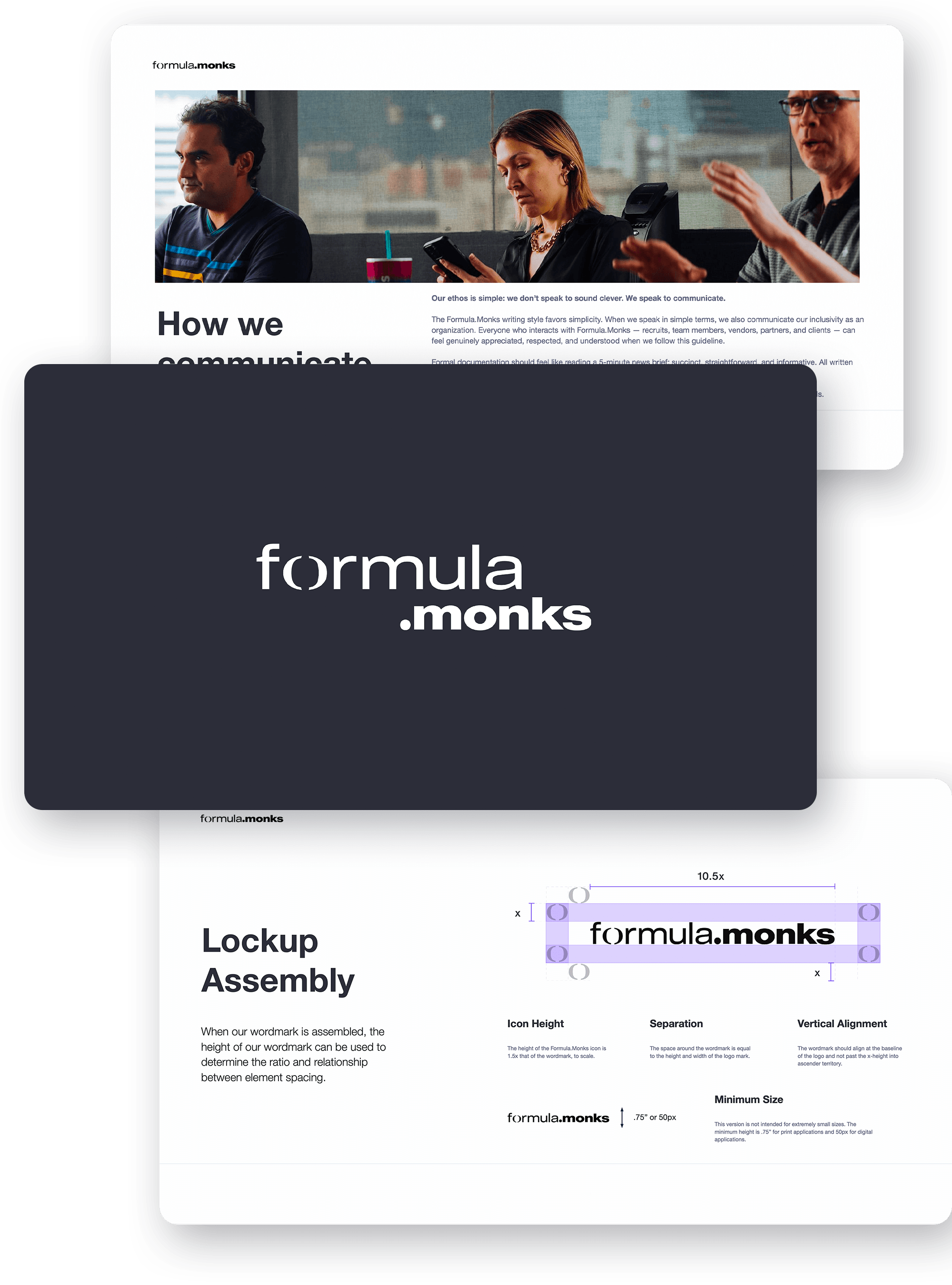 In early conversations with Brady Brim-Deforest, then CEO of Formula.Monks, it became clear that we needed to dig deep before making any design decisions. The merger of TheoremOne and Zemoga deserved more than a logo swap. We studied how each brand showed up on its own and how those identities could sit naturally within the broader Monks ecosystem. The goal was simple: build something that felt distinct but never disconnected.